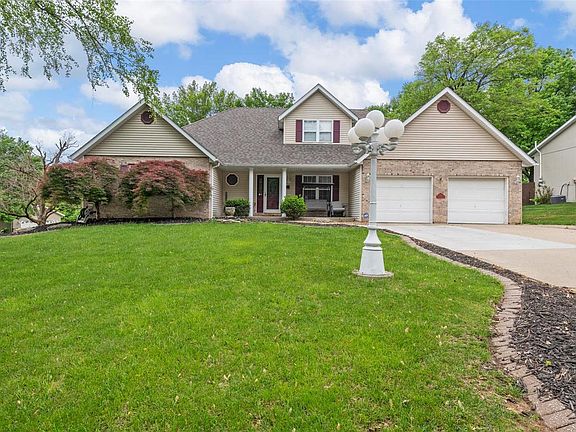 Welcome to 116 Southwood Trace, a beautiful 1.5 story home located on a gorgeous corner lot in Collinsville. Upon entry you are greeted by an inviting front porch and spacious foyer. Vaulted ceiling and woodburning fireplace gauges the eye. Large windows and an abundance of natural light to suit. There's a walkway on upper level that overlooks the great room. A large kitchen with updated cabinetry, quartz counters and breakfast bar to entertain. The first floor primary room is massive & features a walk-in closet. Double sinks, soaking tub and separate shower complete the primary bath. Upstairs you'll find 2 more spacious bedrooms and bath. The lower level has a family room w/gas fireplace and bar area, office, bonus room, storage room and full bath. Walk out to the beautifully landscaped backyard with walking path, above ground pool, deck and a wood privacy fence. Sprinkler system installed to help maintain green space. A lot of home in a wonderful community. Welcome to Collinsville.