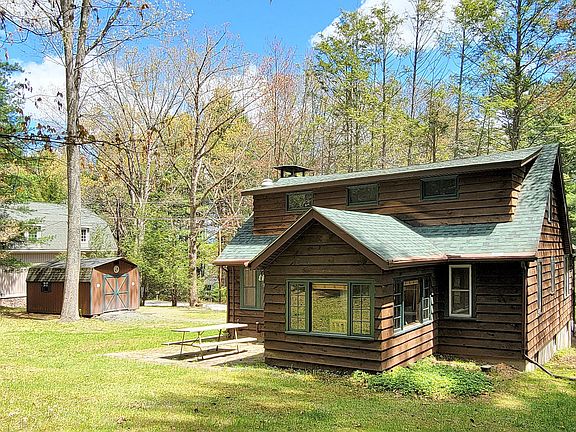 RARE FIND! Deeded Wallenpaupack lake rights and ~NO HOA~! Partial lake view! Charming, year-round cabin accented w/ stacked PA bluestone is located just outside prestigious Spinnler Point. Imagine the possibilities: no dues, rules, or restrictions, yet a short 2-minute walk through the woods brings you to the lake. The home has an open floorplan & thoughtful layout with 3+ bedrooms, 2 full baths, enclosed porch, bluestone fireplace, & plenty of storage. You'll love the ultra-modern kitchen w/ gorgeous granite & stainless appliances. The dining room overlooks the large backyard with a gazebo & patio. Large front deck w/ built-in seating. Full basement w/ handy garage-style door & 2 sheds for storage. Sold furnished. Primo location + low taxes, & great parking = an ideal Airbnb possibility!