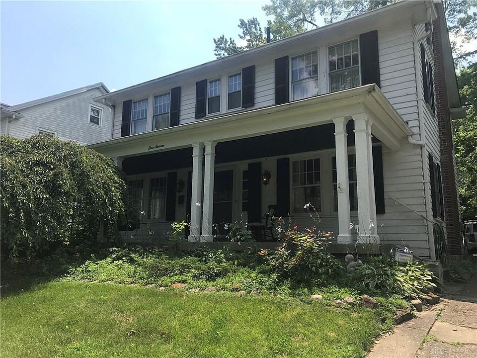 This stately 2.5 story home is located in the Rubicon Mills area of Dayton bordering Oakwood,was built in 1929 - has had only 2 owners-and we even have the original house plans! Light and bright throughout from the amazing and private 33x7 front porch that overlooks the entire neighborhood to the cozy back porch but let's not forget the nostalgic 8x12 sunporch upstairs! A few mainly exterior updates are needed but what potential for increases in square footage-the 3rd level (31x10)is accessed from the hallway staircase and the basement (24x33) has good ceiling height. Amenities include: rich wood trims,crown moldings,2 sets of french doors,hardwood floors on both levels,2 gas fireplaces(one in the bedroom),formal dining room with the kitchen adjacent and accessed by the original swinging service door,large entry highlighted by the rich distinctive stairway to the second level, open kitchen with tiled counters and an attached breakfast nook..