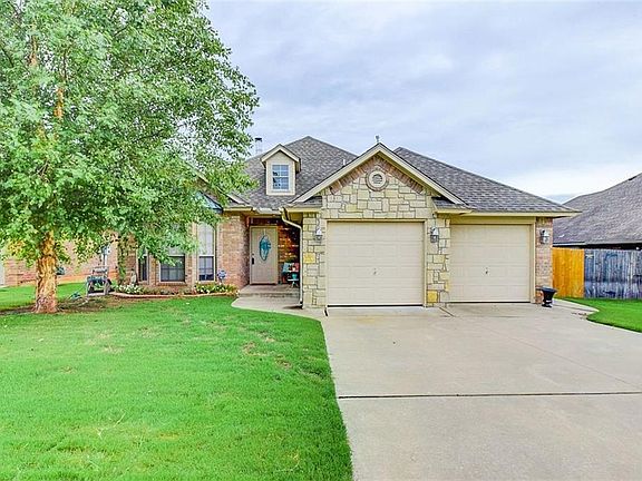 Inviting spaces! Open floor plan with a lovely flow from living to dining to kitchen. Many conversations between the rooms can be had while enjoying friends & family. A true study with French doors & wood floors. Nice sized bedrooms with the master suite away from the other bedrooms for peace & privacy. The living features a brick fireplace. Storm shelter newer fence & covered patio. The home has charm & comfort inside & out. Beautiful area with rolling hills & trees & a neighborhood pool to enjoy.
