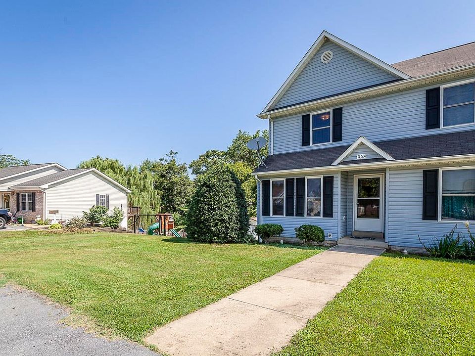 2 Story duplex with walk out basement with poured concrete walls, roughed in for bath and studded room could be bedroom or family room, storage area and washer/dryer hookups. Main level consists of living room with hardwood floors, large kitchen with dining area, ceramic tile, and half bath. Upper level consists of 2 bedrooms with hardwood floors, large closet areas, and a full bath. Nice rear deck and patio for outside entertainment. Lot is .18 acre, +/-, with paved driveway and brick column with decorative light fixture. Interior walls and exterior doors have been freshly painted. Dishwasher & stove are under a year old. Public water & sewer. Close to town and shopping. Owner is licensed to sell real estate in the Commonwealth of Virginia.
