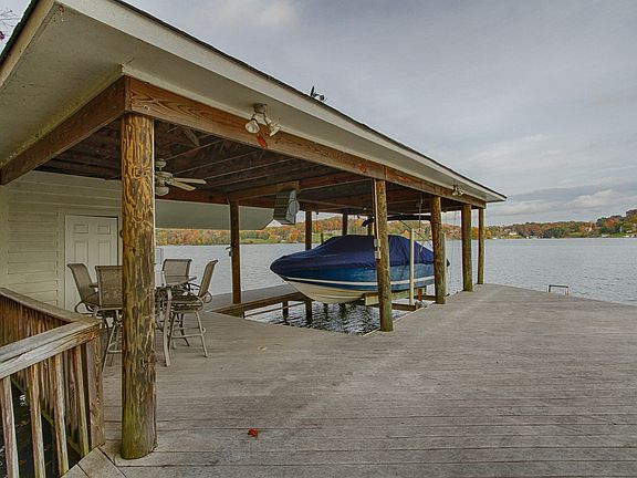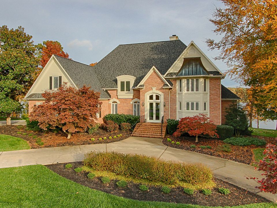 Fabulous 4 BR, 4.5 BA lakefront 2-story basement home in Millers Landing! Year round water! Newly Refinished Wood Floors! Light & Bright Open Floor Plan w/Skylights. Kitchen w/Subzero, granite tops, island/breakfast bar is open to Gathering Room w/walls of windows. 2-story Great Room, w/Lake views, built-ins, gas-log fireplace, adjoins deck with fire pit & gas grill. One-level living with Master Suite w/luxurious BA, adjoining Office, built-ins, & cathedral ceiling & 3-car garage also on Main Level. 3 ensuite BRs + Bonus Room up perfect for guests. Partially finished & plumbed lower walk-out level w/Rec Room, workshop, patio, storage & 2-car garage. Covered Boat Dock w/electricity, city water, & swim platform. $20K+ in reworked, enhanced & raised riprap. Fall/Winter Panoramic lake views