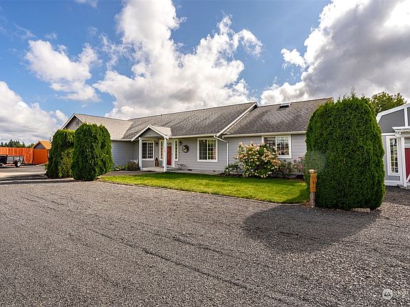 Spacious & inviting home, just shy of 2 acres. Covered front entrance, vaulted ceilings, skylights, large open concept great room/dining room combo, 3 bd 2 bath, attached 3 car garage. This home has it all & more! Utility room, bonus space used as craft rm. Enjoy the patio while taking in the beauty of your landscaped back yard, fenced with & 2 gazebos. Raised flower/garden beds. French doors off great room & primary allow for easy access to backyard. Sprinkler system ensures your green space stays green with little effort. Several outbuildings with lots of storage, one used as a private office space. Covered RV parking w/power & water. Minutes off I-5 yet feels remote. Centrally located between Seattle & Portland.