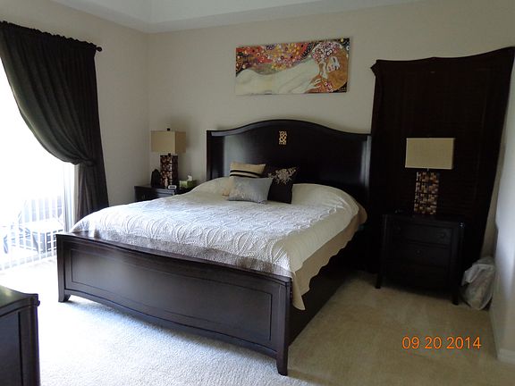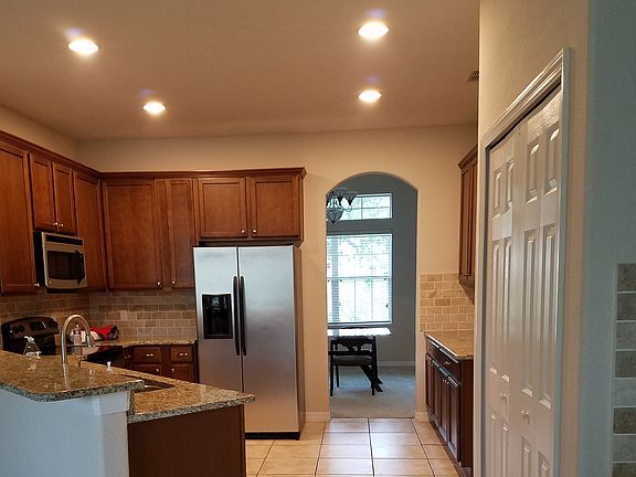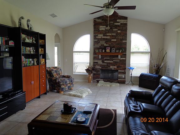 Welcome to this former builder model home. As you enter through the beautiful front door you will see and feel the cleanliness. 4 beds, 3 baths home in Pristine Condition, freshly painted walls, new laminate floors in all bedrooms, dining room and office/den/formal living room. Huge family room featuring a gorgeous stone wood burning fireplace, high ceilings and large sliding glass doors. Squeaky clean kitchen, decorate with a 42" dark maple cabinets, Crown molding, stainless steel appliances and separate desk space with a breakfast bar that opens to the dinette area and family room. The oversize master bedroom gives you direct access to the screened covered lanai. The Luxury master bath includes dual sinks, a jetted tub and separate walk in shower, surrounding by decorative ceramic tile with inserts, his and hers walking closets. Solar water heater and gutters are a added bonus. Located in a gated community and within minutes drive to major grocery stores, hospital, schools, Posner Park, and approximately 19 miles to Disney-world. This home can be yours, come and see it to believe this great deal.