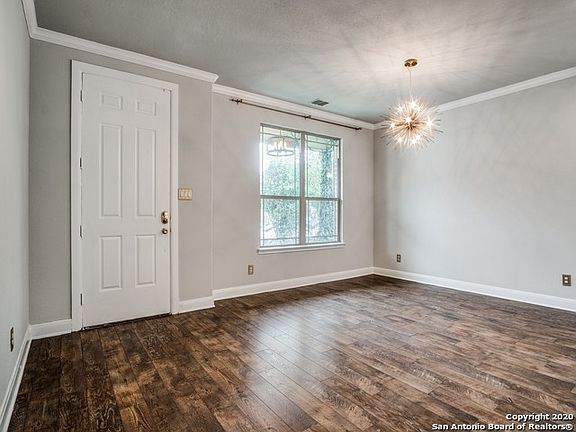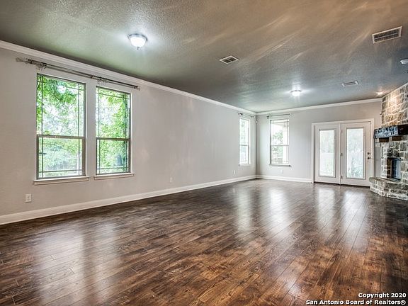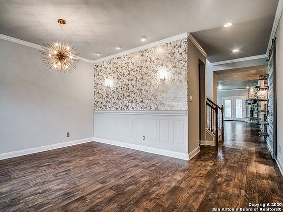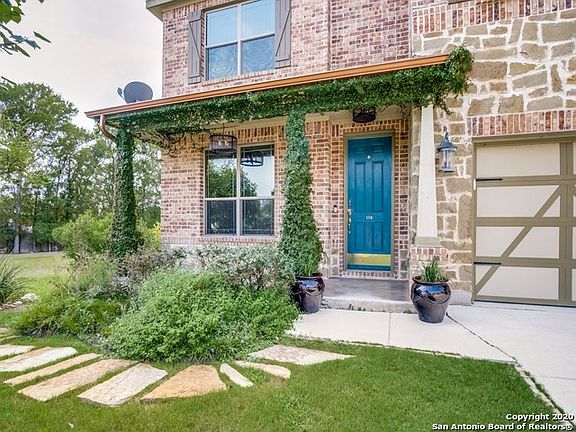 This beautiful home backs to a green belt and is situated on an oversized lot in The Trails of Herff Ranch. The generous floor plan offers comfortable living and is perfect for any scale gatherings! Detailed appointments include farmhouse chic accents, distressed wood, iron pipe floating shelves throughout, upgraded lighting fixtures, tile and backsplashes, Quartz counter tops, custom barn door and crown mouldings. The kitchen is well equipped with an extended flush kitchen island, hidden outlets, breakfast bar, intricate tile backsplashes, stainless steel Kitchen Aid appliances, gas cooking, double ovens and a walk-in pantry with a vintage door. The kitchen also opens to the dining area and family room with a gas fireplace boasting a vintage timber mantel. The downstairs master suite features a spa-like bath, garden tub, walk in shower, extended dual vanity and a generous walk-in closet. A game room, spacious secondary bedrooms and two storage closets complete the upper level. For al-fresco relaxation, the backyard features a privacy fence, mature oak trees, and a covered patio with stained concrete and an extended deck which is perfect when entertaining! The front and back lawns also feature flower beds with an array of colorful flowers, shrubs, a sprinkler system with rain sensors and copper gutters. The oversized three car garage boasts upper storage shelving plus a closet. For additional storage there is a charming shed area with an enclosed garden gate. This property is also conveniently located within walking distance to the surrounding schools and neighborhood amenities, which include a park, pool and trails!