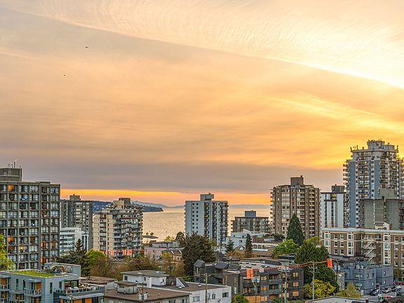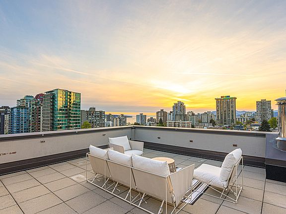 This beautifully fully furnished and remodeled townhouse-style penthouse showcases STUNNING English Bay and North Shore Mountain sunset views! The highlight of this property is its expansive over 600 Sq. Ft. private rooftop deck, offering breathtaking views of the water and cityscape. With two beds and three baths, this home is truly exceptional. The main living floor features 10-foot ceilings and a spacious living area, complimented by a chef's inspired kitchen with a large island and top-of-the-line appliances. Enjoy the expansive living room with indoor/outdoor living from the according style doors to the balcony. Upstairs, you'll find two generously sized bedrooms perfectly appointed with modern furniture, each with its own ensuite bathroom. 1 Parking Stall.