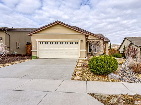 Discover extraordinary 55+ living in this beautifully upgraded and maintained home on Reno's west edge. Built in 2014, this Tahoe model in Sierra Canyon offers 2 bd, 2 ba, and an office/den. The spacious 1,400+ SF open floorplan features granite kitchen countertops, SST appliances, laminate flooring, & primary bedroom bay window. Enjoy the elevated view lot, paver patio with pergola, and low-maintenance landscaping with a golf putting green. This home is not just a residence; it's a lifestyle!, Nestled in the heart of Sierra Canyon, this home offers the perfect blend of comfort and style. The kitchen is a chef's delight, equipped with extra tall birch cabinets featuring convenient roll-out trays, granite countertops with a matching backsplash, a raised bar, and stainless steel appliances, including a French door refrigerator. The thoughtful touches continue with a frosted glass pantry door, adding a touch of sophistication to the culinary space. Hunter Douglas window coverings throughout and ceiling fans in the living room and primary bedroom enhance the already pleasant atmosphere. The primary bedroom is a retreat with a bay window, providing a cozy nook to relax and unwind. French doors at the office/den add an element of privacy and style. The hall bathroom has been upgraded with an extra-deep tub/shower and a convenient grab bar, ensuring both safety and luxury. The laundry room is fully equipped with a washer, dryer, cabinets, and a sink, making chores a breeze. Step into the backyard oasis, complete with a golf putting green, creating a perfect space for entertainment and relaxation while enjoying views of Peavine Mountain. The front yard beckons you to enjoy the outdoors and Sierra mountain views with a covered porch and accents of beautiful Lodi Gold rock. Come live the life you've always wanted in this wonderful 55+ Sierra Canyon community! Amazing amenities include 18,000+sf clubhouse with state of the art fitness center, exercise classes, indoor pool, outdoor hot tub, firepits, expansive patio with spectacular views, indoor walking track, grand lounge, multi-purpose room with catering kitchen, billiards, tennis, pickle ball, bocce ball, miles of paved walking paths, 9-hole golf course, access to driving range and restaurant at Somersett Golf & Country Club, plus limited rounds at a discounted rate at the 18-hole championship course. All of this plus numerous clubs and groups and an active social calendar means never a dull moment.