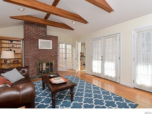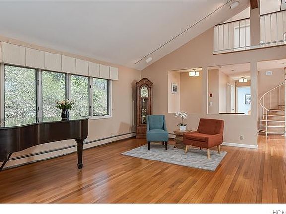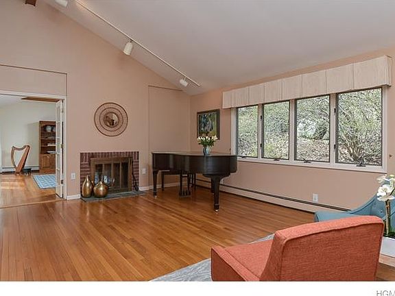 Dramatic Contemporary with soaring ceilings, lots of glass, hardwood floors throughout, private setting nestled among mature trees and lush landscaping on almost 2 acres including side play yard with swing set. Roof 2012, driveway 2012, renovated kitchen and baths. See through fireplace between living room and family room, large deck, above ground oil tank, legal 2 bedroom, lives like a 3 bedroom. *Square footage includes lower level (718sf).