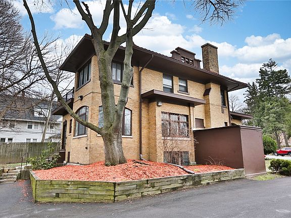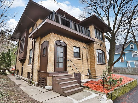 Historic Frank Lloyd Wright inspired brick two-family! Spectacularly renovated first floor apartment features new island kitchen, bath, bedroom/office, enclosed sunroom, 9' ceilings, porch and a spectacular Craftsman inspired fireplace and over-mantle! Leaded and stained glass abounds, including working pocket doors. Bedroom has rear entrance that allows it to function as an office. Great owner occupant suite, and owner would have access to basement. Second apartment comprises 3-4 bedrooms over two floors. Sunporch, sun deck off kitchen, window seats. Basement was legal two-bedroom apartment with full bath and kitchen, and could be again with modifications. Freestanding two-car garage could be garage, studio, or workshop and is plumbed for sinks. Newly paved driveway has parking for up to ten cars. New Spanish style metal roof in 2021. Easy to convert back to a 5+ bedroom single family. Prime location in Upper Monroe near 490...walk to restaurants, Cobbs Hill Park and a short drive to Whole Foods! Delayed Showings until 4/13, Delayed Negotiations until 4/18. To accommodate tenants, group showings in evening only. Also listed under Single Family MLS R1463761.