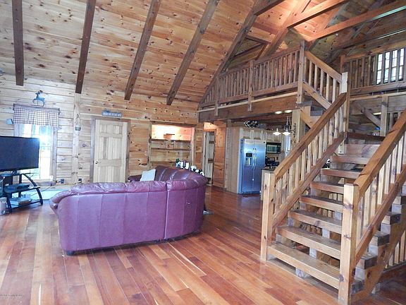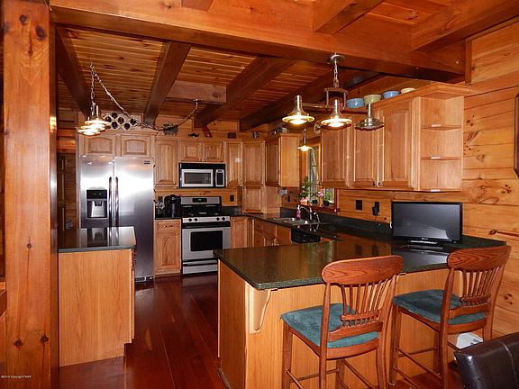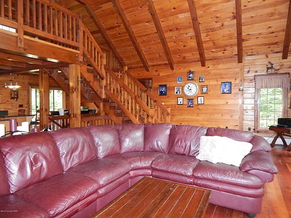 Seller Relocated- a great opportunity for you to acquire an awesome 3 Bedroom Log Home at a fantastic price. Fabulous cherry flooring milled from a magnificent cherry tree on the property, as was the pine trim and window dowels - a great way to connect with Mother Nature and blend into the landscape of Wagner Forest Conservation Park. As your eye leads up to the open loft,high vaulted ceilings, massive log beams emit a sense of strength. Huge open Living - Dining - Kitchen areas let you enjoy family and guests. The master suite features high vaulted ceilings and spacious master bath with whirlpool tub. Efficient Natural Gas. The flex space offered by the2000 sq. ft basement has many possibilities. On 2.1 tree-filled acres in the heart of the Poconos.