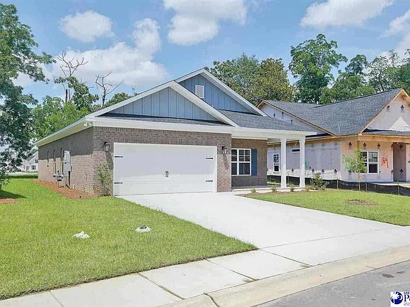Welcome to Easy Living at The Grove in West Florence! This vibrant neighborhood is just minutes from I-20 and I-95 and offers an array of amenities including a community pool, clubhouse, playground, fishing pond & walking trails. The "Mary" floorplan by Hurricane Construction is 1,674 square feet & featuries a two-car garage, front porch & a covered back porch w/ an extended patio area that's perfect for grilling. A durable brick exterior, accented with craftsman-style board & batten siding & crisp white columns- immediate curb appeal! This energy-efficient smart home includes a tankless gas water heater, energy-efficient gas heat, smart WiFi-enabled garage door openers & an irrigation system. Inside, you'll find Luxury Vinyl Plank flooring, Quartz Countertops, white shaker style cabinetry & Samsung appliances including a gas range. The elegant molding & finishes throughout add a touch of sophistication. The primary suite offers a trayed ceiling, oversized tile shower, double vanity & large walk-in closet for added comfort and storage. The Grove is also in walking distance of Ebenezer Park; where residents can enjoy access to an additional playground, tennis courts & baseball field. Also in walking distance of two schools. Whether you're looking for a starter home or considering downsizing, The Grove offers endless amenities and beautifully crafted homes for all. Don't miss your chance—schedule your tour of this brand new construction home today!