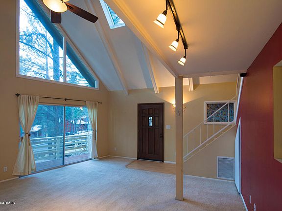 Warm and friendly chalet style home in the desirable University Heights neighborhood. Open floor plan includes great room with vaulted ceilings and a loft. Two bedrooms with full bath downstairs, and a separate master suite upstairs with remodeled master bath including a custom double sink vanity and a jetted tub. Detached two car garage. Big lot with plenty of mature ponderosa pine. Close to schools, NAU & the Urban Trail.