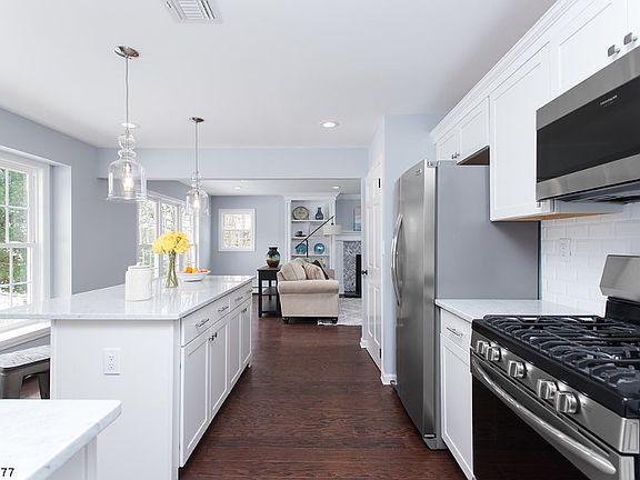 Traditional colonial treated to a complete renovation. New kitchen, baths, floors, siding, windows, and more. Unique design details and high-quality upgrades create an extraordinary like-new home.Brilliant, sun-drenched kitchen elegantly appointed with carrera marble counters, center island, SS appliances, & subway tile backsplash with decorative mosaic. Windows, siding, & wood floors newly replaced. Custom-designed mantel & built-ins surround wood-burning fireplace with chevron marble inlay. Stunning designer light fixtures. Master bath boasts oversize custom glass shower with double sinks. New hall bath with enchanting penny tile. Impressive stone entry opens to foyer. New garage doors & openers. Ready for new owners to enjoy!