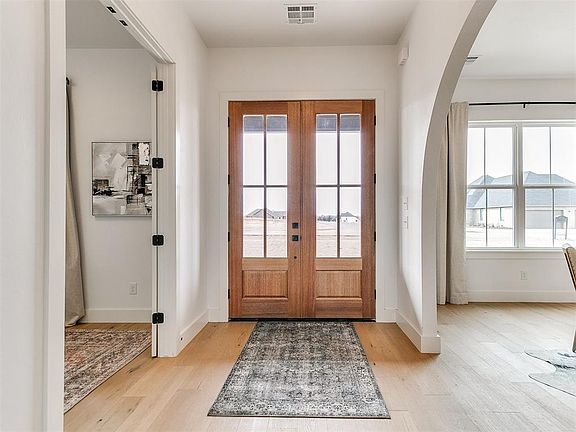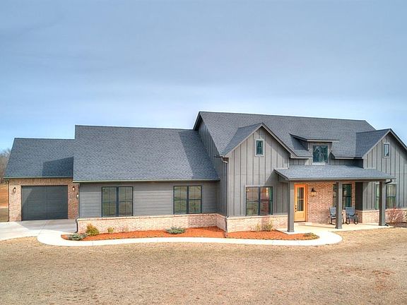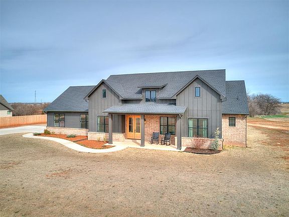 Country charm meets modern luxury in this breathtaking home perfectly situated on 1.5 ACRES of serene countryside. Beautiful 8' double doors, charming archways & gorgeous wood floors welcome you into this entertainers dream floor plan beginning with the expansive dining room including large windows, accent lighting and plenty of room for hosting family & friends. The spacious living room features a soaring cathedral ceiling with statement beam, a cozy fireplace, and a wall of windows showcasing the beauty of this special property & flooding the room with natural light. The living area flows seamlessly into the heart of the home, the huge chef's kitchen, complete with quartz counters, open shelving with under cabinet lighting, and a massive island with tons of seating & storage and beautiful designer pendants. Just beyond the kitchen is an amazing butler's pantry and an extra large laundry room with a sink & built-in shelving. The primary suite is a private retreat featuring a cathedral ceiling with accent beam and a spa-like ensuite that includes two large vanity areas with quartz counters, designer lighting, separate shower, soaking tub and huge walk in closet with built-ins. The fabulous split floorplan includes two generously sized guest bedrooms with large walk in closets and access to a full bath with double quartz vanity & a separate tub/shower area. The 4th bedroom located at the front of the home also makes a perfect study. Spacious drop zone area with mud bench and a half bath with darling designer wallpaper lead to the oversized 3 car garage featuring 8' doors, ideal for taller vehicles, and an in ground storm shelter for peace of mind. Outside enjoy the views from your expansive covered patios perfect for relaxing in nature or taking in those amazing Oklahoma sunsets. Located near Cedar Valley Golf Course with membership options for residents, 15 minutes from Edmond, ALL PAVED ROADS, AT&T Fiberoptic internet, water well (NO WATER BILL), & SHOPS allowed!