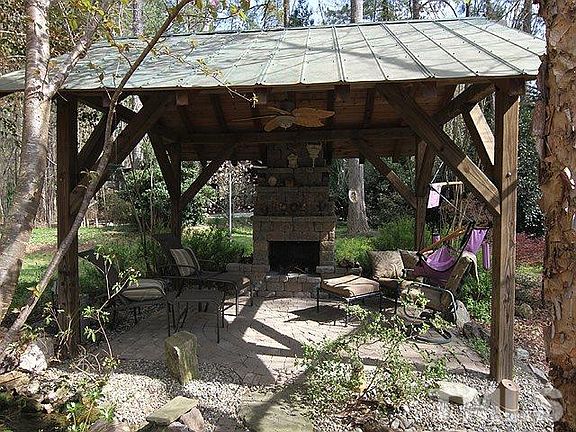 FABULOUS outdoor entertainment areas - huge, covered stone porch- surround sound and TV cable, 2 stone fireplaces with stone patios - one covered for those rainy days (ceiling fan), outdoor grilling area with sink, pond, a secluded, very large covered, building for entertainment/workshop/parking! Home is just as lovely, open floor plan, natural gas available - gas lines come to house and are ready to be used, fresh exterior paint, very large walk-up attic. Be the envy of your friends with this one!