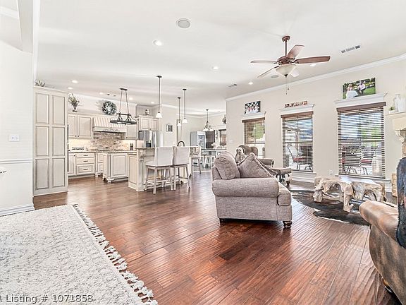 This immaculate home in Riley Farms is a must see boasting 4 large bedrooms, 3.5 baths and a second living area that includes a wet bar. Split floor plan, large living room/dining room, and a large covered back porch makes family time and entertaining easy! Mud room/laundry room, safe room, central vacuum, gorgeous hardwood floors, carpet in the bedrooms and tile in the bathrooms. Covered back porch, large fenced-in backyard, hot tub and a 4-car garage. The hits just keep on coming!