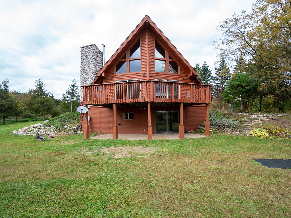 The house is all wood, all interiors are knotty pine and oak. The south facing open main floor (20 ft. ceiling) has a wall of windows, efficient wood burning stove, and large deck. The walk out basement has another bath and rooms. Primary bedroom is an open loft with a large soaking tub, and private west side balcony to enjoy the views and take in all the nature that is drawn to the native plants, trees, mature gardens on and surrounding the property. There is a large concrete slab for your garage/pole barn. House and decks stained 2021. Located on paved road 3 miles to US 12, 11 miles to M 52, abuts Frog Holler farm. The stove, refrigerator and hot water tank have all been adapted to propane. It has an underground storage tank that has a 1000-gal capacity.