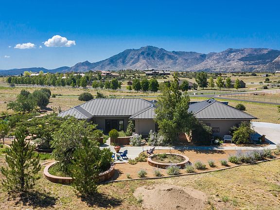 Welcome home to Blue Spruce Farms spanning 6 acres with jaw dropping views of Granite Mountain. This home's construction showcases steel studs, metal roof, zero VOC Paint, whole house air filtration system, a passive solar design to achieve a 7 degree heating/cooling delta, and owned solar system with battery backup. Wonderfully situated home boasting travertine tile throughout with in-floor radiant heating and new AC unit just installed. Kitchen offers solid wood cabinets, granite counter tops, and stainless steel appliances. Enjoy views from the bright great room of Granite mountain on one side to the herb garden on the other. The master retreat gives way to a huge walk in closet, large soaking tub and subway tiled shower. Relax your worries away with the indoor sauna.