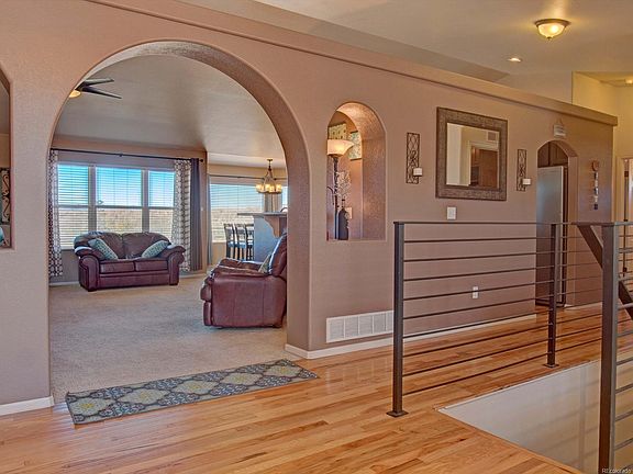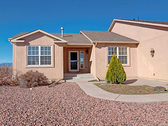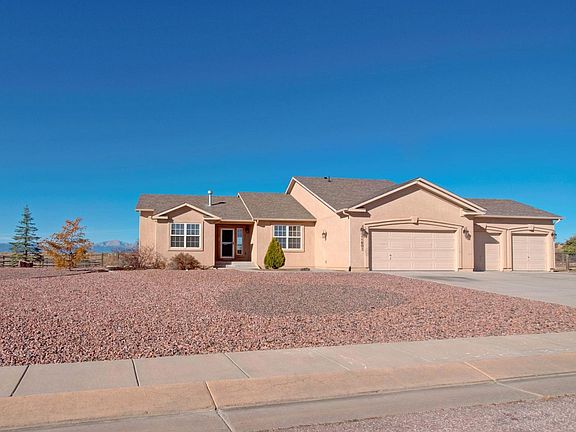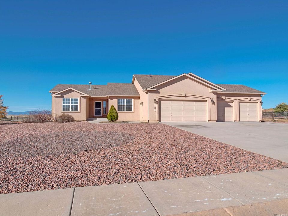 Stunning Stucco Rancher on one-acre lot w/ Pikes Peak Views! Main Floor Master Suite w/5-piece bath, walk-in closet & Private sitting room. Spacious Living Rm fea: gas fireplace, Mountain views & Opens to dining nook & Kitchen. Flex room next to stairs can be used as Formal Dining. Kitchen has SS Appliances, Granite Counters, Deep Composite sink & pantry. 2 Add. bedrooms, full bath & Laundry w/Storage & utility sink complete main level. The Bsmt has office nook w/Storage Closet, Junior Suite w/ attached bath, 5th bedroom, full bath, rec room, Dry Bar & Family Room. 4-car garage is perfect for gear-heads, moto-enthusiasts, families w/ multiple drivers or just more room for storage. Easy Commute to Schriever, Peterson and the Academy. Close to Dining/Shopping and Schools.