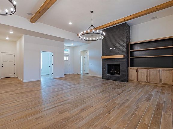 Amazing New Home, Custom built maple cabinets with 3cm quartz/granite throughout. 12-foot Ceilings in living room with custom beams, brick fireplace surround, Stainless steel whirlpool appliances, Study plus 3 bedrooms, 1/2 bath, surround sound system in living room. Bluetooth speakers in Master bath. Master Bedroom with vaulted ceilings, double vanities, framed mirror surround, Whirlpool tub & walk-in shower. Designer paints with satin finish. Custom lighting packages with ceiling fans in all bedrooms, Brick exterior with oversized patio, Sprinkler system, Security system, STORM SHELTER in garage floor, Blinds, and more. Right across the street is Wild Horse Park where residents can enjoy the natural beauty of a 153 - acre park featuring a fishing pond, walking and bike trails, a community garden, and sports complexes including softball and baseball fields and soccer fields. Mustang Town Center across the street has access to workout rooms, basketball courts, swimming pool, library and senior center, offering an active lifestyle for residents of all ages. Special financing available!