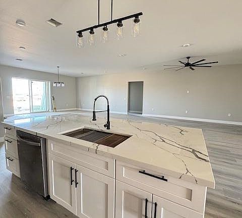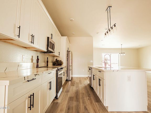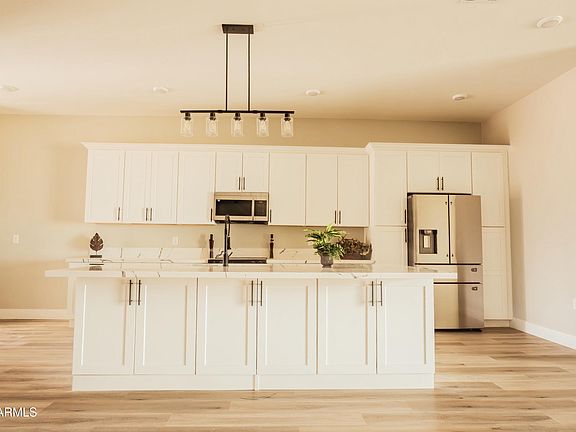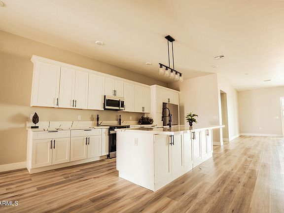 Discover luxury and comfort in this stunning newly built single-level residence in Buckeye, featuring 2x6 construction for superior durability. Boasting 10ft+ ceilings, a captivating open floor plan, and elegant wood-style flooring, this home is designed for modern living. The impeccable kitchen is a chef's dream, featuring sleek stainless steel appliances, quartz countertops, chic recessed lighting, and an oversized island with a breakfast bar, all complemented by white cabinetry with crown molding. With five spacious bedrooms and three stylish bathrooms, including a grand Great Room and a lavish master suite with a spa-like ensuite, large shower, and freestanding bathtub, this home offers both comfort and sophistication. Walk-in closets and pristine finishes elevate the space even further.
