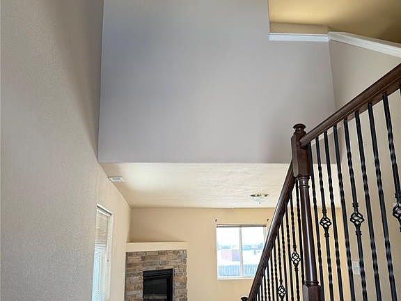Cozy fireplaceFully fenced backyardSprinkler systemGenerous primary suiteOpen kitchenLarge islandSoaring vaulted ceilings