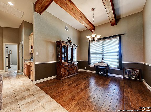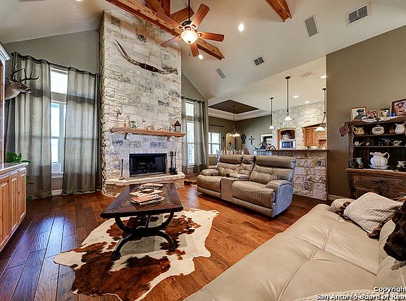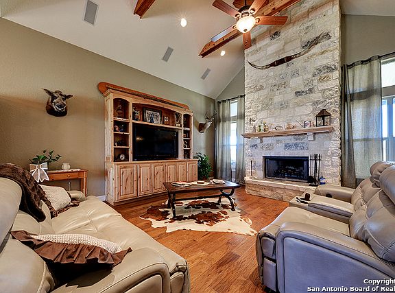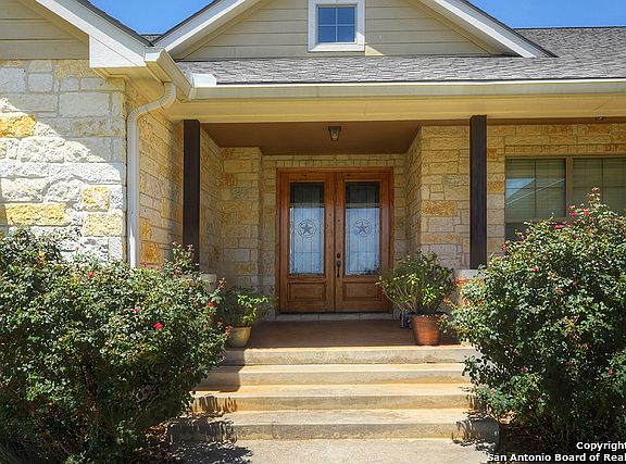 Beautiful single story custom home on nearly 14 acres. AG EXEMPT. Gentlemen's Ranch ready for raising cattle, horses or hay. Completely fenced, century oaks and located just a mile off 1604. Home is stunning with craftsmanship quality. Large walk-through shower. Open granite kitchen with island, breakfast bar and custom cabinetry. Party size covered patio and outdoor fireplace. Insulated 30x30 workshop wired with 110/220V along with exterior RV hookups. Additional 25' carport and 15' covered RV storage.