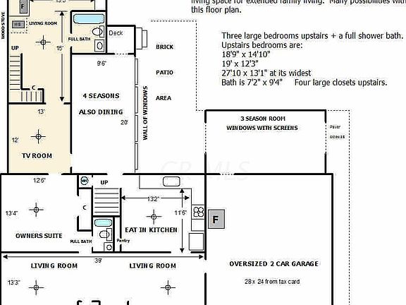 Over 2,700 sq ft home on 4.78 acres. Unique floor plan offers many options. Many updates. 3 large bedrooms up + hall shower bath. Main level 37 x 14 living room, good size eat-in kitchen, TV room, Owners suite with full bath, 2nd living room - 3rd full bath - laundry and 2nd kitchen ideal for mother-in law suite with possible private main floor bedroom or private upstairs bedroom or both. Large 4 seasons dining area (22x10). Deep 28 x 24 attached garage + 24x12 3 season room attached behind garage. Brick patio. Fenced back side yard great for pets. 2 story metal sided barn with several possible stall areas + garage space. Fenced pasture. Possible pond site?