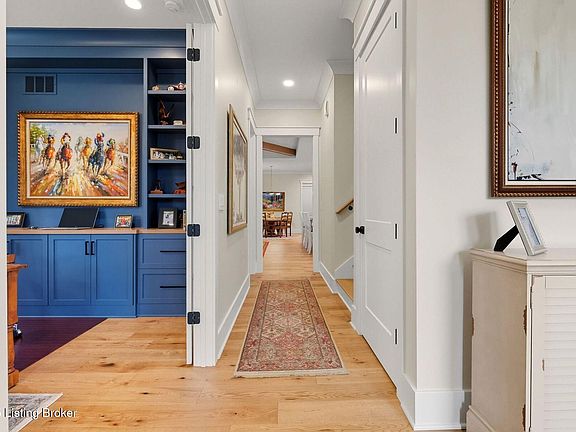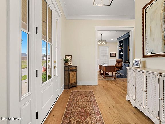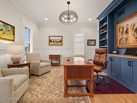 Introducing this thoughtfully crafted residence in the coveted Hamlet section of Norton Commons. A charming front porch framed by fresh landscaping sets a welcoming tone before stepping inside. The foyer introduces light-filled, purposeful spaces. To one side, a private sitting room with a full bath offers an ideal retreat for guests, while the opposite side features a handsome home office with floor-to-ceiling built-ins and a custom credenza—perfect for working or studying from home. A stylish powder room is tucked nearby for convenience. At the heart of the home, the gourmet kitchen boasts a large island, stainless steel appliances, and a spacious walk-in pantry. Flowing seamlessly into the dining area and gathering room, this open layout is designed for effortless entertaining. Extend gatherings outdoors to the screened-in porch with fireplace, creating a cozy haven for year-round enjoyment. The first-floor primary suite provides a luxurious retreat, complete with dual vanities, a generous walk-in closet, and spa like finishes. Conveniently connected, the laundry room offers direct access to the expansive three-car garage. Upstairs, two additional bedrooms and a full bath are joined by a landing highlighted with built-in bookshelvesand an inviting nook for reading or relaxation. The unfinished basement with egress window and full bath rough-in provides endless opportunities for future living space. Modern comfort is elevated with a geothermal system, ensuring both efficiency and sustainability. Blending elegance, comfort, and function in every detail, this home is ready to welcome its next owner. Schedule your private showing today.