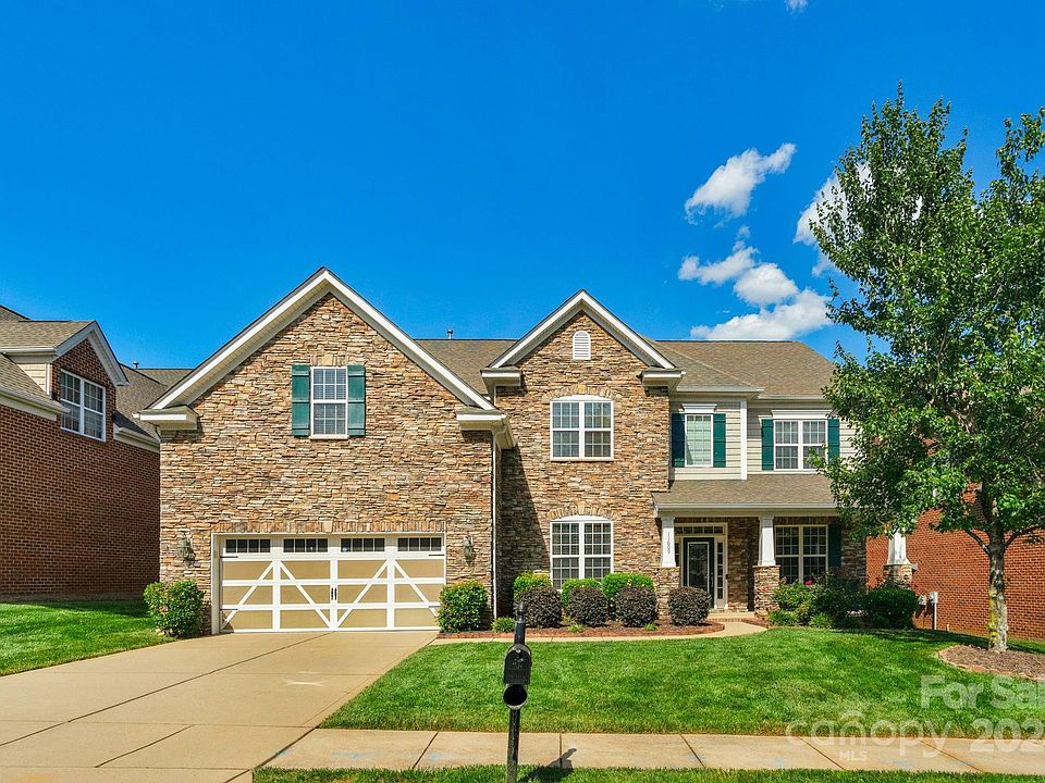 NEW! Freshly painted interior and new carpet installed 7/12! Stunning full brick and stacked stone home is located near Blakeney Shopping Center. This spacious residence offers generously sized rooms throughout. The versatile flex room can serve as an office, sitting room, or playroom. A first-floor guest suite provides convenient, stair-free living. The expansive great room, featuring a gas fireplace, seamlessly connects to a gourmet kitchen with stainless appliances, granite countertops, and a walk-in pantry. The luxurious upstairs primary suite boasts a separate tub and shower, and an oversized walk-in closet. Additional bedrooms, bathrooms, and huge bonus room upstairs ensure ample space for everyone. The flat backyard, lined with newly planted evergreens, provides enhanced privacy in the future. Enjoy community amenities including an outdoor pool, clubhouse, and playground. Proximity to Firethorne Country Club, Blakeney, Ballantyne, and Ardrey Kell HS enhances this ideal location.