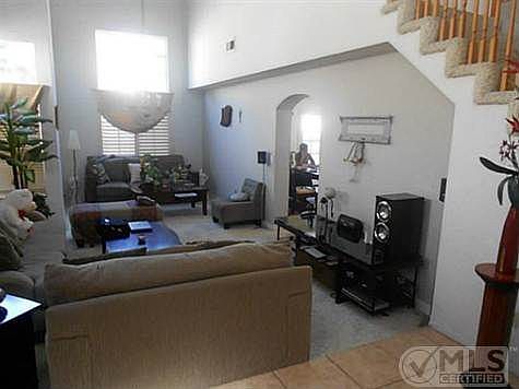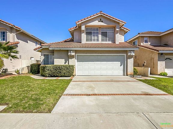 Desirable Rancho San Diego! Largest model in the neighborhood! Immediately you are greeted by high vaulted ceilings and a custom professionally painted cathedral sky. Two separate living areas downstairs allow plenty of space for entertaining. Main level includes 1 bedroom downstairs with attached 4 piece bathroom. Wood and tile flooring throughout the downstairs and carpet in all bedrooms upstairs. French doors lead directly to the beautifully landscaped backyard and concrete patio.