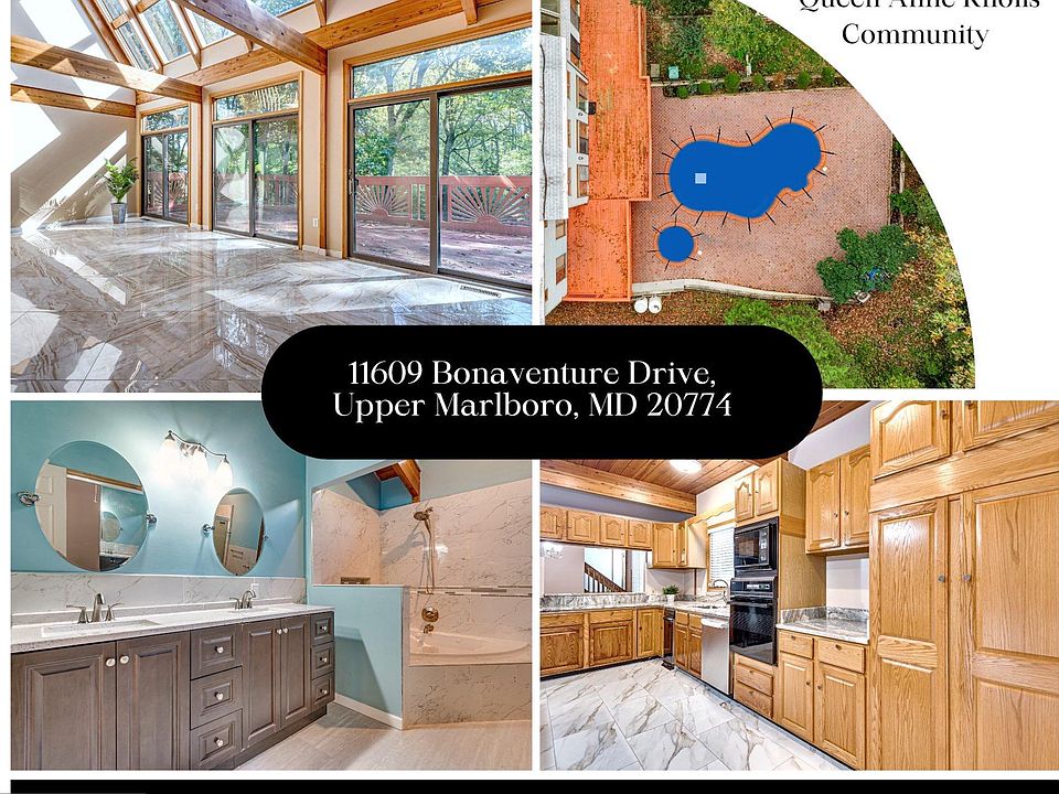 The property will be available for showings on Friday, 4/26 A luxurious newly renovated home in the Queen Anne Knolls community of Upper Marlboro is settled on over two private acres. A spectacular open floor plan with a formal dining room and abundant natural light cascades through the floor-to-ceiling windows, highlighting the gorgeous exposed beam ceilings and hardwood floors—luxurious renovations to all bathrooms, a gourmet kitchen, interior paint, and Brazilian Cherry hardwoods. A replaced roof in 2020 and HVAC systems in 2021. A spectacular open-floor gourmet kitchen inspires gourmet dining adorned by pendant lighting, a spacious center island with a breakfast bar, ample storage, sleek appliances, a breakfast area, and granite counters, and it guides you into the sprawling four seasons sunroom. Relax and unwind through the upper-level family room with one of three brick fireplaces and through the French doors into the tranquil primary bedroom suite highlighted by a vaulted ceiling with rich wood accents, and an en-suite bath with a walk-in closet with laundry, a double vanity, ceramic tile, and a jetted soaking tub. Two additional bedrooms on the main level with a full bath and two bedrooms and a hall bath on the upper level complete the sleeping quarters. The fully finished lower level has an additional kitchen, a third wood-burning fireplace, and a bath with a sauna for quiet spa time. The living room and recreation room have a bedroom and an office or possible bedroom. The Basement has a walkway to the rear deck or stone patio with an in-ground pool and hot tub. Recently installed, a new sprinkler system. New flooring in the kitchen, sunroom, main entrance, and bathrooms. The deck was recently painted. The three-car garage and circular driveway provide an ideal space for additional parking. Major commuter routes include US-301, MD-214, and US-50 for easy access to points north and south.