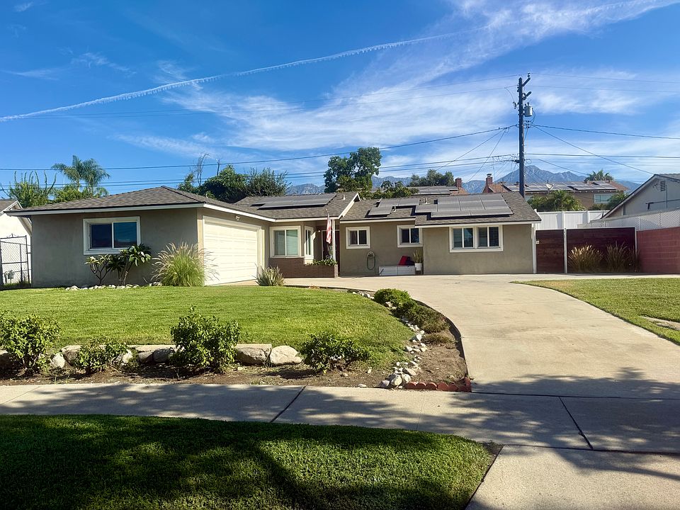 Situated at the end of a quiet cul-de-sac in one of North Upland's most sought-after neighborhoods, this elegant single-story home combines comfort, style, and energy efficiency. The residence offers three bedrooms and two bathrooms, enhanced with solar panels that help significantly lower electricity costs, especially during the summer months. Inside, a welcoming living room with a classic fireplace sets a warm and inviting tone. To the left, the dining area transitions seamlessly into a remodeled kitchen featuring stainless steel appliances and tasteful finishes, creating an ideal space for both everyday living and entertaining. A hallway leads to three well-appointed bedrooms, including a primary suite with a bathtub and dual access either through the bedroom or the hallway, complemented by a second bathroom with a walk-in shower. The backyard is perfect for outdoor living, complete with a covered patio for dining or relaxation and a grassy area for play or leisure. A two-car attached garage adds convenience and storage. Beyond the home, residents enjoy a peaceful and exceptionally safe community in North Upland, just minutes from The Commons, local parks, hiking trails, shopping, and dining. This property is part of the distinguished Upland Unified School District, served by Foothill Knolls STEM Academy of Innovation and Upland High School. Tenant responsibility includes all utilities, with landscaping services provided. Owner pays gardening. Tenant responsible for all utilities.