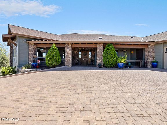 Discover an extraordinary 1.12-acre estate where luxury meets tranquility, perched majestically overlooking Prescott Lakes with breathtaking forever views that stretch beyond the horizon. This magnificent 4-bedroom, 4.5-bathroom sanctuary spans 5,873 square feet of meticulously crafted living space, offering an unparalleled blend of sophistication and comfort.The grand great room showcases soaring beamed ceilings and expansive windows that frame spectacular views from every angle, while the heart of the home features a meticulously updated kitchen adorned with gleaming countertops, a wall oven, a warming drawer, and ingeniously designed multi-level storage solutions. Culinary enthusiasts will delight in the seamless flow between the formal dining area and charming breakfast nook, both blessed with inspiring Prescott Lake views.The wraparound deck beckons with its built-in raised fire pit and sophisticated outdoor kitchen, complete with a substantial gas grill--perfect for those who believe the best conversations happen under starlit skies. The sumptuous primary suite serves as your personal retreat, boasting stunning vistas, deck access, and a spa-like bathroom that flows seamlessly into an expansive walk-in closet and continues to a substantial laundry room with built-in office space. An additional upper-level office with a custom-built-in desk and elegantly remodeled powder room enhances the home's functionality.The lower level presents a sprawling family room accompanied by three en-suite bedrooms, each boasting individual walk-in closets and private bathrooms.Thoughtful amenities include an oversized Utility room, which features an abundance of built-in storage cabinets, three-zone climate control, an indoor/outdoor dog run, and a thoughtfully designed oversized three-car garage with ample storage, including an electric vehicle charging station.Residents enjoy exclusive access to The Club at Prescott Lakes, featuring a Hale Irwin-designed 18-hole golf course and a state-of-the-art Athletic Center with indoor and outdoor pools, tennis and pickleball courts, and exceptional dining experiences at The Grill where guests can enjoy remarkable vistas of the 18th fairway, the iconic Granite Dells, and the majestic San Francisco Peaks, making it an ideal setting for any occasion.