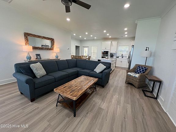 Welcome to a true coastal masterpiece — a nearly new luxury home nestled along the scenic shores of the Currituck Sound. Built just last year, this residence offers a perfect blend of modern elegance and relaxed waterfront living, with thoughtful details in every corner. Step inside to an open-concept floor plan adorned with shiplap accents, a cozy gas fireplace, and abundant natural light throughout. The gourmet kitchen is a dream for any chef, featuring a large island, stainless steel appliances, a butler's pantry, and custom cabinetry designed for both beauty and functionality. The primary suite is a private retreat, boasting an oversized spa-inspired bathroom with custom tile shower, dual vanities, and generous storage. The walk-in closet, nearly the size of the bath itself, features wood shelving and abundant space for organization. Just off the kitchen, a spacious screened-in porch invites you to unwind — perfect for morning coffee or evening relaxation while surrounded by the peaceful sounds of nature. Step outside to an open patio ideal for grilling and entertaining, complete with a handcrafted picnic table for memorable outdoor gatherings. Upstairs are two private bedrooms with ample closet space. Oversized attic space providing tons of storage and additional room possibilities. Beautifully landscaped grounds with lush shrubs enhance the home's coastal charm, leading you to your private dock —perfect for fishing, paddle boarding, kayaking, water sports or docking your boat. Whether you're enjoying sunrise views from the front porch or a sunset boat ride across to Duck or Corolla, this home captures the very essence of luxury waterfront living. Don't miss your chance to own this remarkable Currituck Sound retreat — where modern craftsmanship meets timeless coastal serenity.