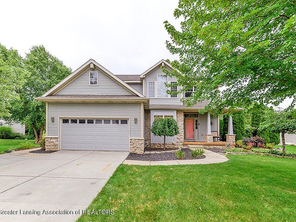 Welcome to this beautiful custom-built home, located on Grand Ledge's east side. This home has so much to offer with 3 bedroom and 2 full and 2 half baths. Notice the large open kitchen that includes a breakfast bar and stainless appliances. Just off the kitchen is a formal dining room that can be used as a den/office as the eat-in kitchen includes a large dining area. This home has an open, airy floor plan that will be great for entertaining. With 9 Ft. ceilings on the main level to the soaring entry and the cathedral ceiling in the master bedroom. Located on the second level is the spacious master with his and hers closet and master bath with double sinks. Also located on the second floor you will find two more additional bedrooms and full bath. This home has tasteful neutral décor throughout. This wonderful two story, also offers a partially finished lower level with a great family room with daylight windows, a half bath and an overabundance of storage in the unfinished area of the lower level. Outside you will find a 36x18 in ground pool, with a diving board and decorative concrete all of which is completely enclosed with a privacy fence Great for entertaining! Updates in last 4 years include new tile in the kitchen foyer area, new furnace in 2020, pool pump, paint, installed a ½ bath in LL level