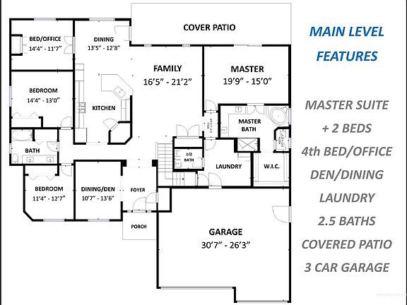 - Bath-Master, Bed-Master Main Level, Split Bedroom, Den/Office, Formal Dining, Family Room, Rec/Bonus, Double Vanity, Walk-In Closet(s), Breakfast Bar, Pantry, Granite Counters, Number of Baths Main Level: 2, Number of Baths Upper Level: 1, Bonus Room Size: 21x13, Bonus Room Level: Upper