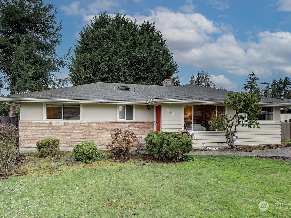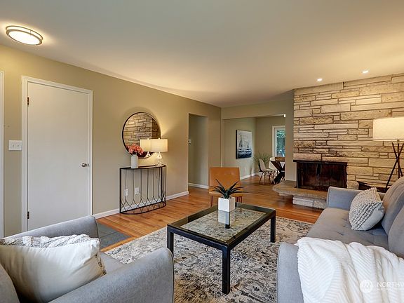 This beautiful Shorewood mid-century modern home welcomes with a striking centerpiece fireplace, beautiful hardwood floors, high ceilings, expansive windows, four bedrooms, and 1-1/2 bathrooms. The spacious yard is fully fenced, with French doors leading from the dining room to a patio - perfect for seamless indoor-outdoor living. Additional highlights include off-street parking, fresh paint, new carpet, elegant light fixtures, and an abundance of charm throughout. With an excellent floor plan, this home offers a generous living space. Conveniently located near restaurants, cafes, markets, public transportation, and major highways, as well as being near Westwood Village, White Center, and downtown Burien.