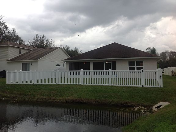 Fabulous 4 bedroom, 2 bath & 2 car garage home on a pond in a gated community of Rose Haven. The 4th bedroom does not have a closet. This is a newer community and will have a community swimming pool for your enjoyment. The kitchen is a chef's delight with corain counter tops, lots of cabinets, roomy and a brick accent wall. There is a cook top and separate oven for the cooks in the family. This home features a great room plan and split bedroom plan. The master bedroom is big with a huge walk in closet. Bathrooms have corain counter tops and the master bathroom has a garden tub for relaxing after a long day. You will enjoy the inside laundry room with newer washer and dryer. There is a large screened patio for you enjoyment while watching the wild life on the water. This home is completely fenced with a beautiful pvc fence. Great for little ones and pets. Home had gutters and a set of patio doors that meet up to date wind resistant codes installed in 2018. There is an ADT security system. HOA fees cover basic cable, trash pickup and community front gates. Furniture is available. All you would need is a toothbrush and clothes! Don't wait for a new built when you can have this home today! Close to the Suncoast Expressway for an easy commute to Tampa & St. Petersburg. You will be happy when you see this home. It is the one you will want to buy!