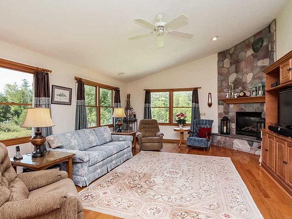 This 4 bedroom, 2 and a half bath ranch is loaded with extras and ready to move right into! This home sits on approximately 11 acres with a private pond as well as Wabasis Creek which winds throughout the property. The property also includes a Pole Barn and a separate updated guest home on the property. You enter the home into a large foyer and a very open floor plan. There are amazing views from all the rooms including a very large 3 season room. The main floor consists of a Living Room with fireplace, large open Kitchen area with an island and a Dining Area and Breakfast Nook area with a door to the backyard deck. The Master Bedroom has a fireplace, two walk in closets, and large Master Bath with 2 individual sink areas. A Laundry Room, Half Bath and the 3 Season Porch complete the
