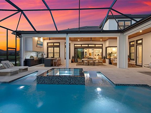 Every detail of this lakefront residence was designed to inspire — a rare opportunity to own one of Esplanade Lake Club’s most extraordinary homes. Perfectly positioned on a Southern-facing cul-de-sac lot, this custom-designed estate offers nearly 5,000 square feet of living space, ultimate privacy, and panoramic lake views. With a private dock and expansive outdoor living, it’s a home that defines resort-style living — where every space feels as comfortable as it is beautiful. Sophisticated yet inviting, this residence blends elegance with comfort and livability. The open-concept floor plan features 5 bedrooms plus home office/den, 4 full baths, 2 half baths, and a 3-car garage. A grand great room anchors the home with custom ceiling treatments, a natural gas fireplace, and serene water views. The first-floor primary suite provides a peaceful retreat with spa-inspired ensuite bath and generous walk in closets. The gourmet kitchen is a chef’s dream with GE Café appliances, quartz countertops, a reverse-osmosis water system, and a spacious walk-in pantry. Upstairs, a versatile bonus room with kitchenette and a guest suite with custom built-ins offer the perfect space for family or guests. Step outside to your private lakeside oasis — a heated custom pool with infinity-edge spa, sun shelf, and putting green all overlooking tranquil waters. Entertaining is effortless with a full outdoor kitchen featuring Blaze grill, Summerset pizza oven, refrigerator, and cypress wood ceiling with electric roll-down screens. Additional features include impact-resistant windows and doors, a 26kW Generac Guardian Natural Gas generator, and meticulous designer details throughout. Furniture package is negotiable. Located within Esplanade Lake Club, a 352-acre gated lakefront community on Lake Como just on the Estero border, residents enjoy premier amenities including a lakefront beach, Bahama Bar & Grille, fitness center, tennis, pickleball, bocce, dog park, and more. All within minutes of RSW Airport, Gulf Coast Town Center, and world-class shopping and dining. Modern design. Panoramic water views. Unmatched privacy. This is Esplanade Lake Club living at its finest.