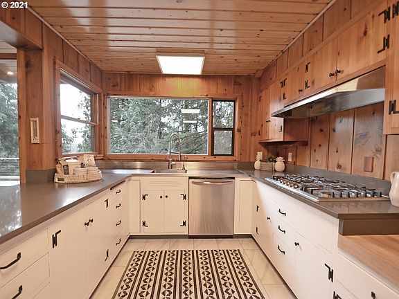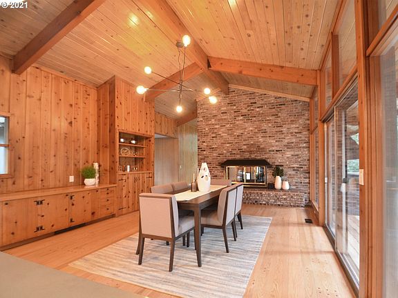 This Frank Lloyd Wright inspired mid-century daylight ranch on a junior acre captures the best of that era & more! The original owner clad each room with the finest woods of the West: Birdseye Maple, Incense Cedar, Crows Feet Hemlock, Sitka Spruce & Redwood. The vaulted living & dining rooms look out a wall of windows to a creek & woods. The central brick floor-to-ceiling fireplace extends to the BBQ/smoker on the large deck. The basement has a greenhouse. So many built-ins! Too much to list!