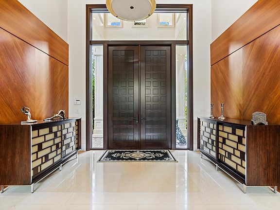Inside, the home is modern, spacious, and bathed in natural light, thanks to oversized impact-resistant sliding glass doors and windows. Custom ceiling details combine finely crafted level 5 drywall coffers with rich maple and mahogany beams. The millwork is of the highest quality, and additional spaces include a study, gym, custom fireplace, wine room, and home theater with upgraded electronics.