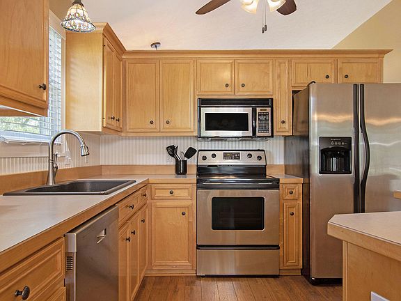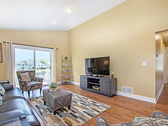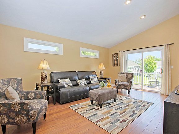 Welcome Home! This gorgeous 4 bed, 3 bath ranch is situated on a quiet cul-de-sac in popular Riley Ridge subdivision, overlooking the serene, private pond. The spacious main-level features vaulted ceilings, beautiful hickory laminate floors, and many large windows, providing plenty of coveted natural light. The lovely, open kitchen boasts stainless steel appliances, maple cabinetry and convenient center island. The master suite includes a walk-in closet and roomy bath with jetted tub and plenty of storage space. The finished lower level adds two generous bedrooms, full bath, and a large family/recreation room with new, plush carpet. Step outside onto the beautiful Trex deck overlooking the new stone patio, firepit, and sandy beach. Enjoy tooling around on the pond in a paddleboat or kayak. Drop a line in the water and you may even catch a fish! Call today to make this beautiful house your home!