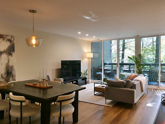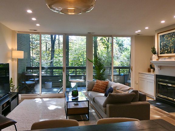 Enter through a welcoming foyer with a storage closet and powder room into an open-concept main level filled with natural light from large windows and sliding doors to the private balcony. Beautiful flooring flows throughout the space, connecting the dining room and a cozy living area with a wood-burning fireplace and built-in storage. The renovated kitchen features modern appliances and generous storage.