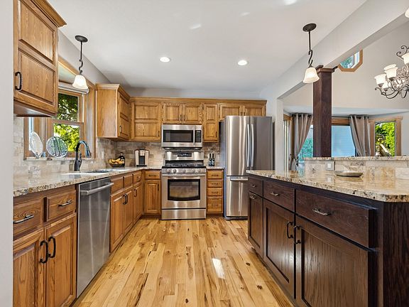 Pride of ownership shines here! Meticulously maintained with many upgrades & updates! On the outside, you'll find ALL newer concrete driveway & sidewalk, black fencing, brick front, 2 maple trees & BRAND NEW roof! The vinyl sliding, windows & deck, & 3-car garage plus extra parking pad are a bonus. On the inside, you'll find an open main floor kitchen/dining room remodel including granite counters, stainless appliances, beautiful hardwood flooring & stairs, & island for food prep & casual dining. The upper level includes a vaulted sun room with transom windows, custom blinds, & a ceiling fan, a spacious primary bedroom w/walk-in closet & updated walk-thru bath. The lower level boasts a large family/entertainment area with plenty of room for a game or pool table, & another nicely updated bath. The unfinished 4th level laundry area has lots of space for storage, workout area, etc. Other updates include plenty of fresh paint & new furnace & A/C. 1-YR home warranty for the buyer included!