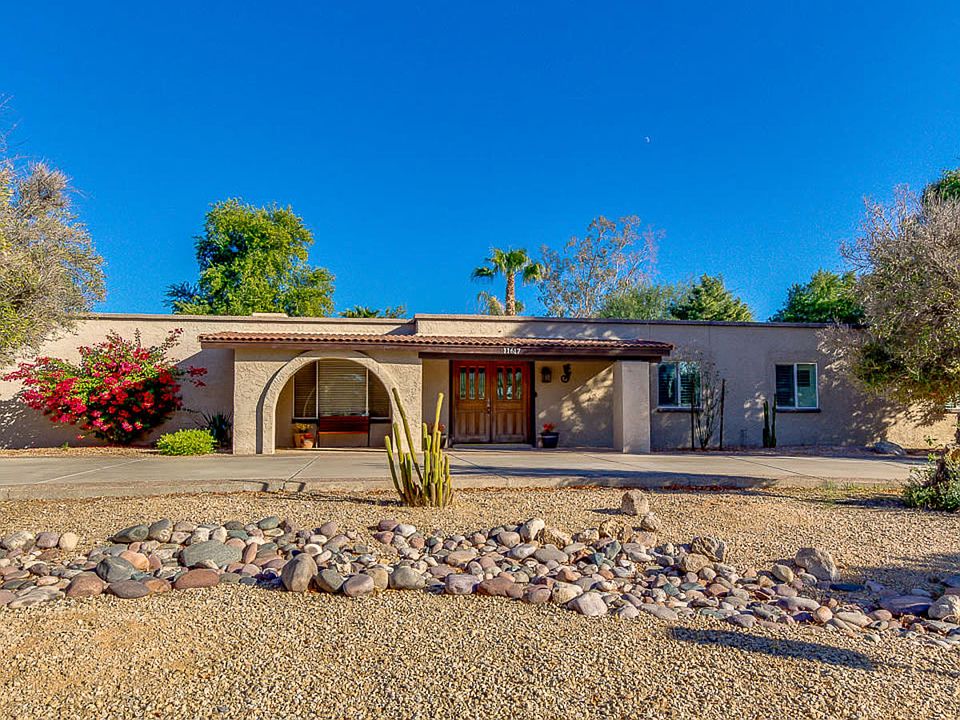 Horse property in Desert Hills North. 5 bedroom (2 master suites w/split floor plan), 3 bath. Concrete driveways for 12+ vehicles. Detached 3 car garage. Landscaped back yard with fenced salt water pool, BBQ island, and fire pit. Pergola off sunroom. Granite countertops. Open kitchen/dining. French doors along back. View of McDowell Mountains from backyard. Front yard view of Starfire golf course across street. Great neighborhood with high-performing Scottsdale Unified schools. No HOA.
