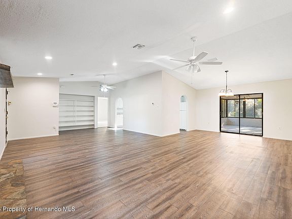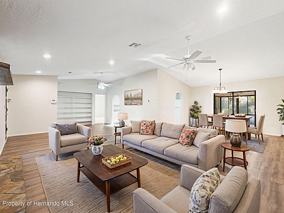 Set on a full acre of land surrounded by mature trees and natural beauty, this beautifully maintained 3 bedroom, 2 bathroom home offers spacious living with vaulted ceilings, wood-style flooring, and a charming wood-burning stone fireplace that anchors the main living area with warmth and character. The kitchen is bright and functional, featuring crisp white cabinetry, modern appliances, and generous Formica counter space with a bevel edge, all framed by graceful arched transitions that enhance the architectural flow. Each bedroom is light-filled and inviting with brand new carpeting and ceiling fans, while the bathrooms include tasteful finishes and thoughtful accessibility enhancements. Additional highlights include a dedicated laundry room, a sunroom wrapped in windows overlooking the backyard, and a pristine two-car garage with attic access. The roof was replaced in 2017, the AC system was updated in 2020, and a new electrical panel adds peace of mind and modern reliability. Aerial views reveal the home's placement within a peaceful wooded landscape, surrounded by winding roads and generous plots that offer privacy and a sense of retreat. The expansive backyard, shaded by moss-draped oaks and bordered by natural foliage, is ideal for relaxing, entertaining, or simply enjoying the quiet. Located just 4 miles from the Suncoast Expressway, the property offers effortless access to Tampa and surrounding areas, making commuting smooth and scenic. Nearby attractions include Weeki Wachee Springs State Park (6 miles), known for its crystal-clear waters and river adventures; Hernando Beach (13 miles), perfect for waterfront dining and sunset views; and Westfield Citrus Park Mall (28 miles), offering a wide array of shopping and entertainment. This home is more than a place to live—it is a place to feel grounded, inspired, and truly at home.
