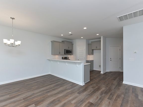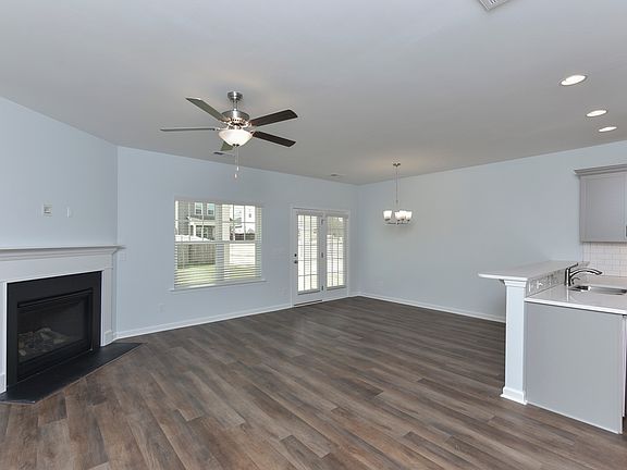 This beautiful Craftsman-style home has three bedrooms, two-and-one-half baths, an upstairs loft with French doors and a two-car garage. A private but inviting foyer leads into an open kitchen with gorgeous quartz countertops, subway tile backsplash, stone grey cabinetry with hardware, all complete with under cabinet lighting and stainless steel appliances. The kitchens bar seating opens into the eat in and family room. The family room has a gas log fireplace and overlooks the covered porch and back yard. As you head upstairs you will find an extended master suite with a walk-in closet, double vanity sinks and a large linen closet. This plan has the loft option with added French doors to give an extra space for your family to use as needed. Upstairs also features two additional bedrooms with a shared full bath, and laundry room. Luxury faux wood vinyl flooring throughout the home both up and downstairs except for bedrooms and bathrooms to give a seamless look. The exterior is complete with front and back yard irrigation to keep up the curb appeal!