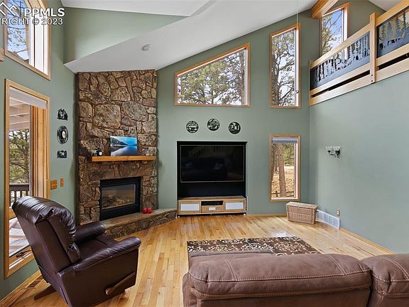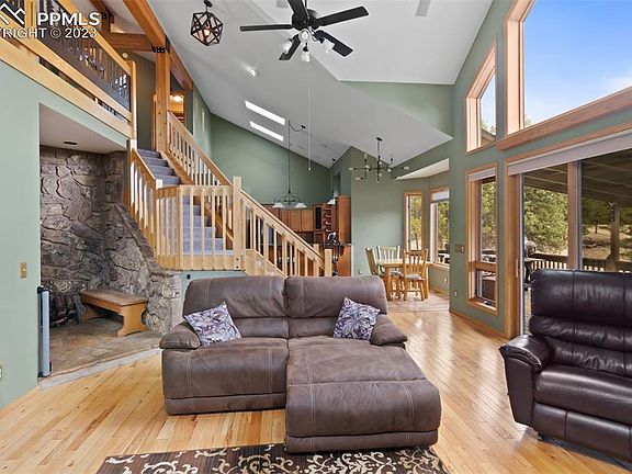 Welcome to Ranch Resorts!!! This beautiful home will not disappoint. Every inch of the 4.98 acres will leave you in awe. This home is nestled amidst breathtaking natural beauty and is a true sanctuary for those seeking a serene retreat. This property offers a unique blend of tranquility, adventure, and jaw-dropping inspiring vistas. The property provides a perfect escape from the hustle and bustle of everyday life, offering you a chance to reconnect with nature and find peace of mind. This custom cedar mountain home features 3 bedrooms and 4 total baths. Upon entry you are met by the intricate detail of the flagstone foyer adorned by moss rock wall. The library near the entrance is well crafted with the oak bookshelf built-ins and the beautiful hard wood floors. The great room presents 18 foot cathedral style ceilings with vaulted beams that will make it cozy to enjoy the gas fireplace while you are surrounded by natural light with all of the beautiful windows. There is also a large expansive deck that leads you to the outdoor paradise. The kitchen is adorned in Saltillo tiled floors with granite counter tops. The lower level of the home presents an au pair suite with another living room and a full kitchen. Beautiful rock adorned fireplace is present for all of those cozy at home nights. This space is perfect for your extended stay guests as this space also harbors a walk out from the basement. The upper lever hosts the primary suite with lots of extras. Primary suite presents vaulted ceilings with separate sink vanities, a spa like shower and a large jetted tub. Two large walk in closets make this primary suite complete. A few short steps in the hallway will take you to the full bath and the other bedroom. The upper level bedroom needs no imagination as you will feel like you are sleeping in a wooded cabin. It is creatively illustrated with balcony access. There are so many extras with this home! Here is your chance to own a piece of Ranch Resorts.